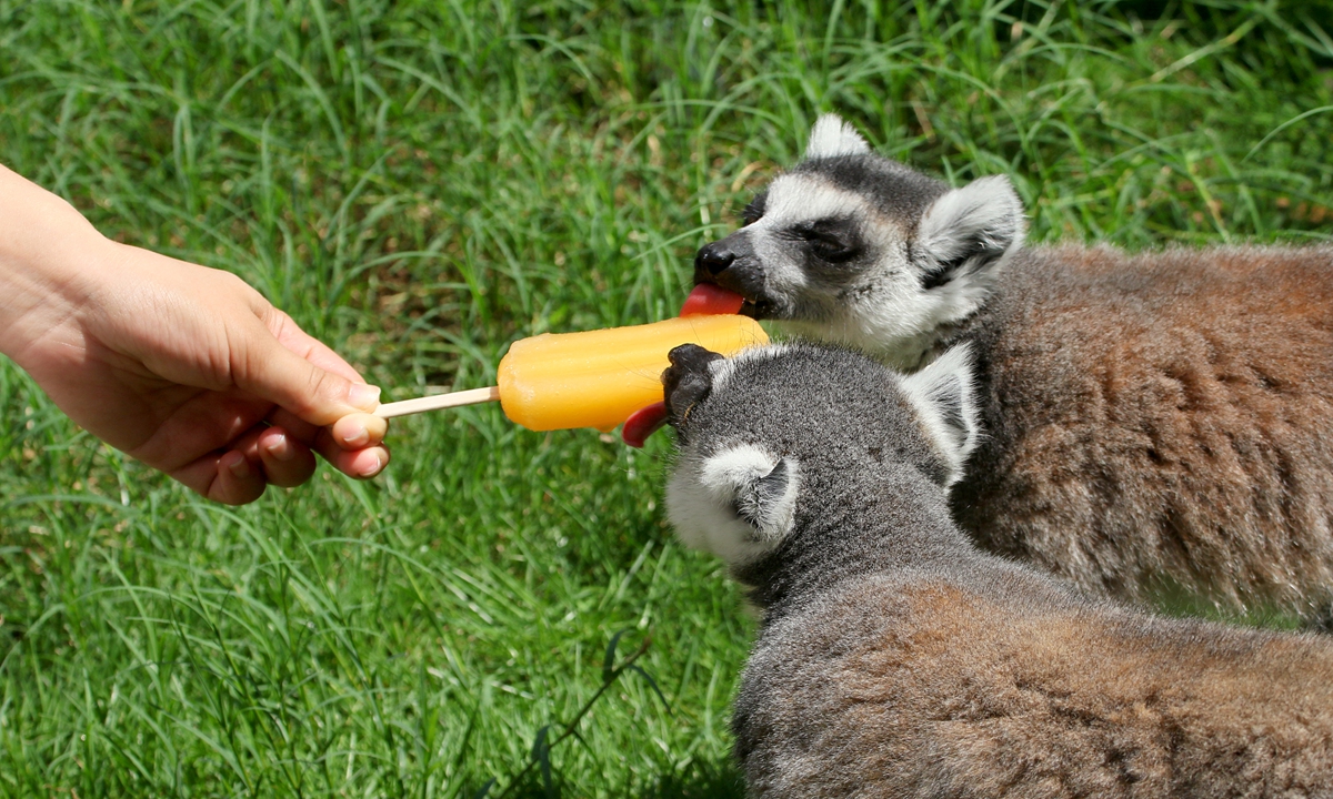 Two ring-tailed lemurs eat a popsicle held by a zookeeper in Yantai, East China's Shandong Province, on Monday to beat the summer heat. Photo: IC