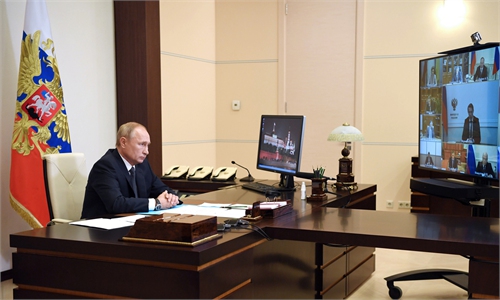Russian President Vladimir Putin chairs a meeting with members of the government in a teleconference call at the Novo-Ogaryovo state residence outside Moscow, on Tuesday. Putin claims Russia has developed the first vaccine offering sustainable immunity against the novel coronavirus. Photo: AFP