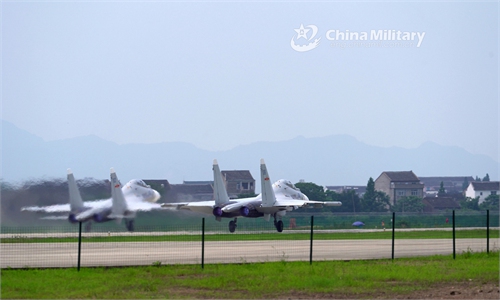 Two fighter jets attached to a naval aviation brigade under the PLA Eastern Theater Command take off simultaneously from a military airfield in East China's Zhejiang Province for a recent flight training exercise. (eng.chinamil.com.cn/Photo by Liu Yaxun)