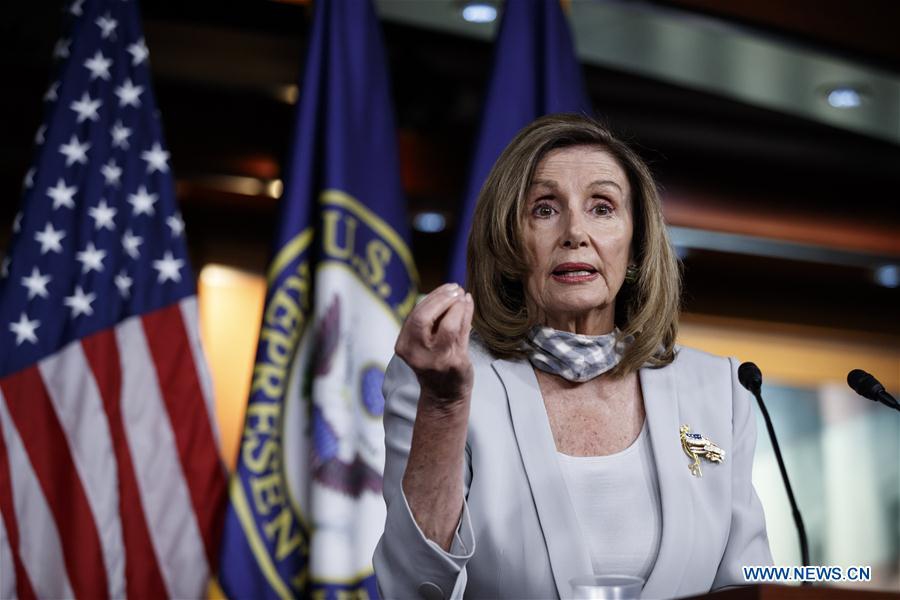 U.S. House Speaker Nancy Pelosi speaks during her weekly press conference on Capitol Hill in Washington, D.C., the United States, on Aug. 13, 2020. The impasse in U.S. Congress over renewal of the expiring programs that mitigated the economic impact of the COVID-19 pandemic threatens to undo the stimulus effect of the programs and exacerbate the economic damage from the lockdown, according to a newly released study. (Photo by Ting Shen/Xinhua)