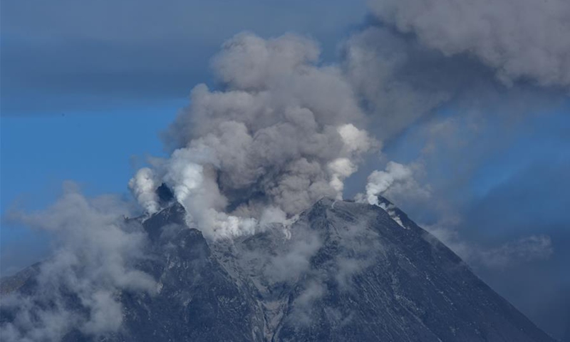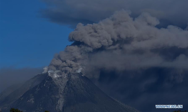 Photo taken on Aug. 23, 2020 shows Mount Sinabung spewing volcanic materials at Karo, North Sumatra, Indonesia. (Photo by Kusuma Wijaya/Xinhua)