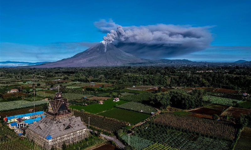 Aerial photo taken on Aug. 23, 2020 shows Mount Sinabung spewing volcanic materials at Karo, North Sumatra, Indonesia. (Photo by Kusuma Wijaya/Xinhua)