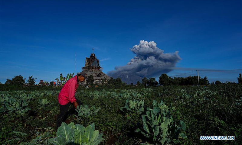 A farmer checks cabbage on his farm as Mount Sinabung spews volcanic materials at Karo, North Sumatra, Indonesia, Aug. 23, 2020. (Photo by Kusuma Wijaya/Xinhua)
