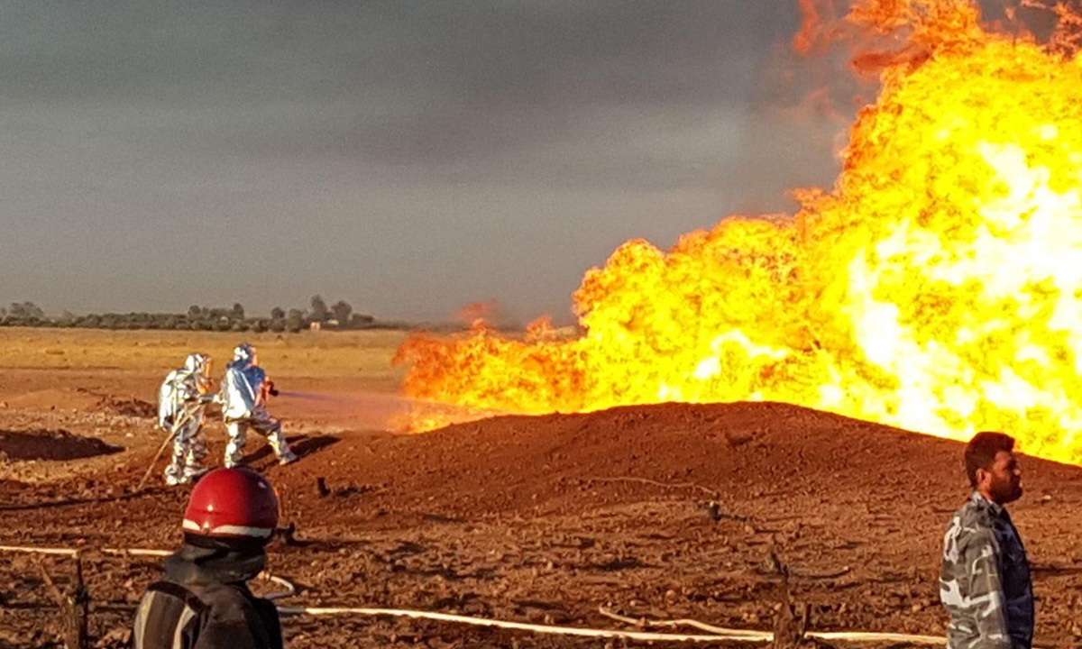 A handout picture released by the official Syrian Arab News Agency early on Monday, shows Syrian firefighters putting out a burning pipeline between the areas of Adra and al-Dhamir in the Damascus area. A suspected attack on a pipeline in Syria caused a nationwide blackout overnight, the state news agency quoted authorities as saying. Photo: AFP