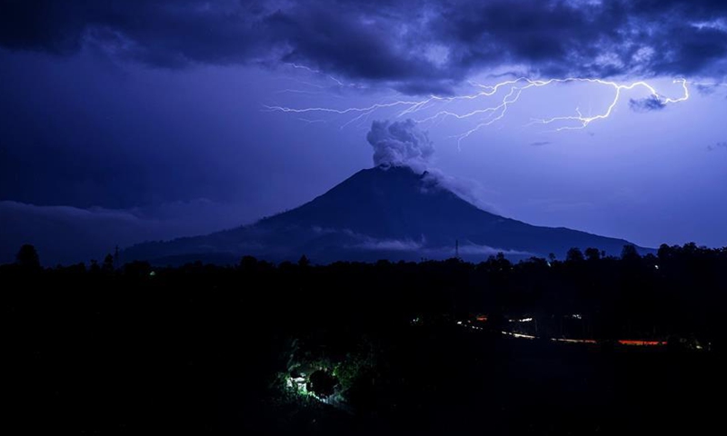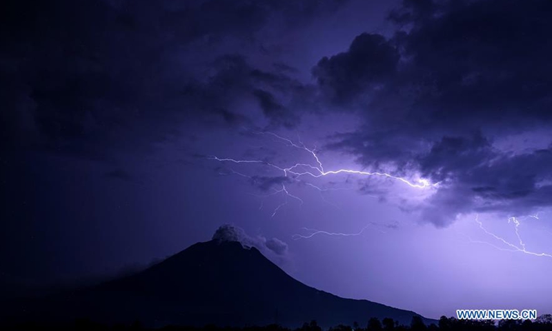 The long-time exposure photo taken on Aug. 23, 2020 shows lightning striking near Mount Sinabung at Tiger Pancur village in Karo in North Sumatra, Indonesia. (Photo by Mirza Baihaqie/Xinhua)
