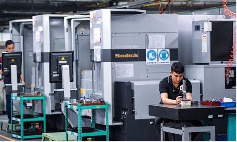 Workers are seen at a workshop in Longhua science and technology park of Foxconn Technology Group in Shenzhen, south China's Guangdong Province, Feb 22, 2019. (Xinhua/Mao Siqian)