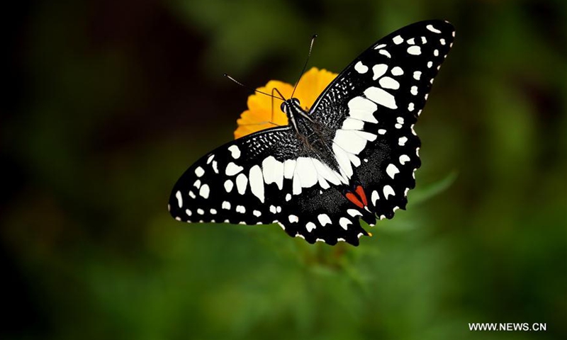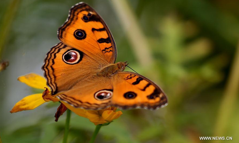 A butterfly collects pollen from a flower on the outskirts of Yangon, Myanmar, Aug. 24, 2020. (Xinhua/U Aung)