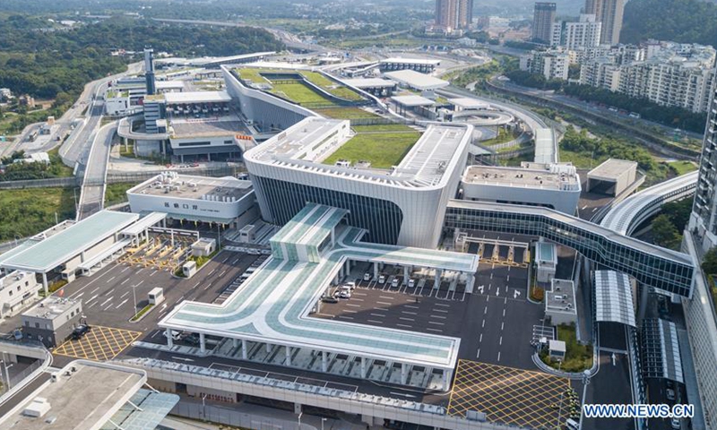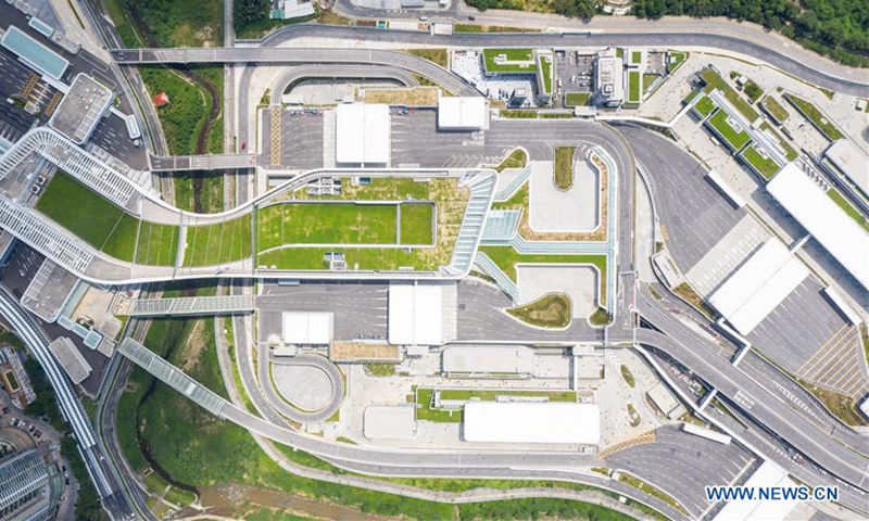 Aerial photo taken on Aug. 26, 2020 shows the Liantang Port/Heung Yuen Wai Boundary Control Point at the Hong Kong-Shenzhen boundary in south China. With a new checkpoint linking Shenzhen opening on Wednesday, Hong Kong will be able to tap more opportunities in the enormous markets of the Guangdong-Hong Kong-Macao Greater Bay Area. The Liantang Port/Heung Yuen Wai Boundary Control Point started opening to cargo trucks Wednesday. (Xinhua/Mao Siqian)