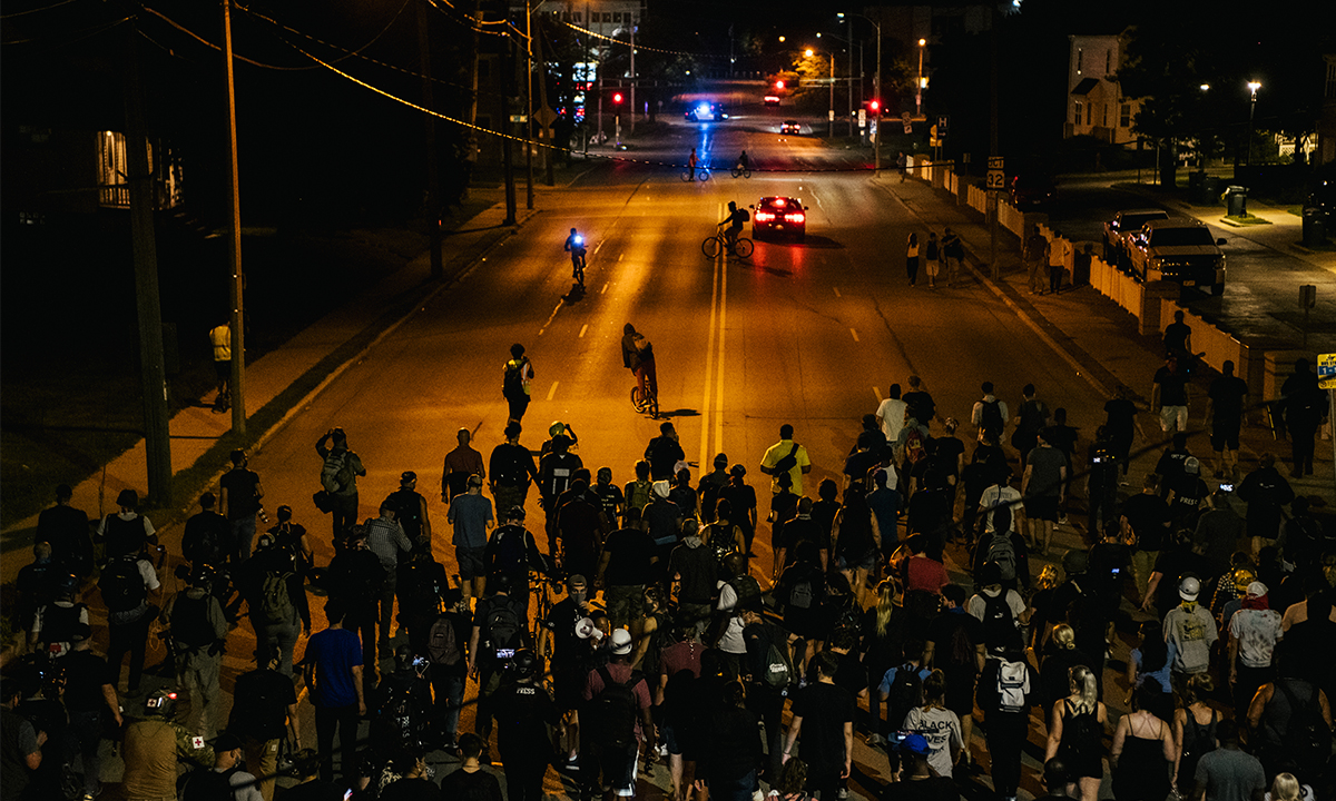 Demonstrators march on Wednesday in Kenosha, Wisconsin. The city declared a state of emergency curfew after a fourth night of civil unrest after the shooting of Jacob Blake on Sunday. Photo: AFP