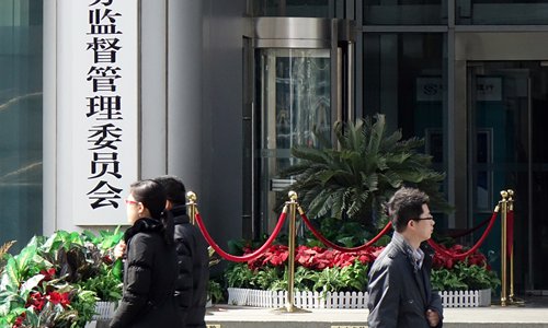People walk outside the headquarters of the China Securities Regulatory Commission in Beijing. File photo: VCG