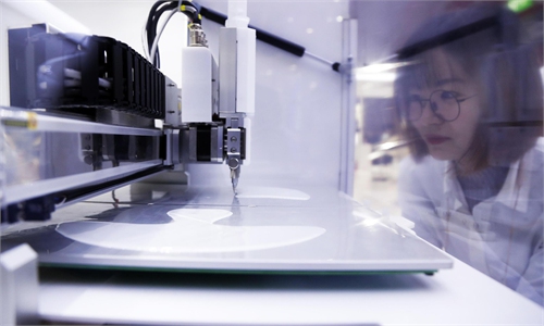 A drone is used to spray pesticide in a rice paddy in Taizhou, East China's Jiangsu Province on Thursday. Local autumn grain production is going through a crucial period in preventing insect infestations, with drones employed to protect crops. Photo: cnsphoto