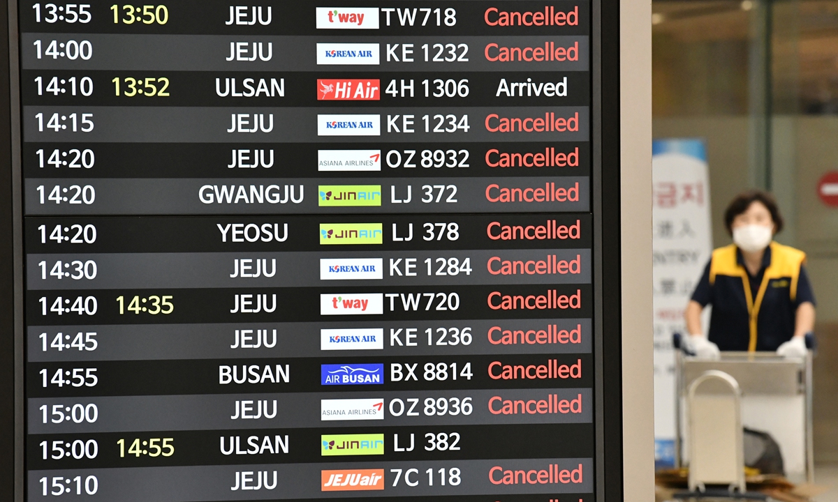 An information board shows canceled flights ahead of the arrival of Typhoon Maysak at Gimpo domestic airport in Seoul, South Korea on Wednesday. Flights were grounded in South Korea and storm warnings issued on both sides of the Korean Peninsula as a typhoon forecast to be one of the most powerful in years. Photo: AFP