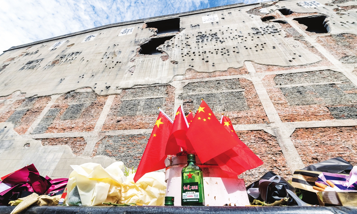 Tributes are placed in front of Sihang Warehouse in Shanghai. Photo: IC