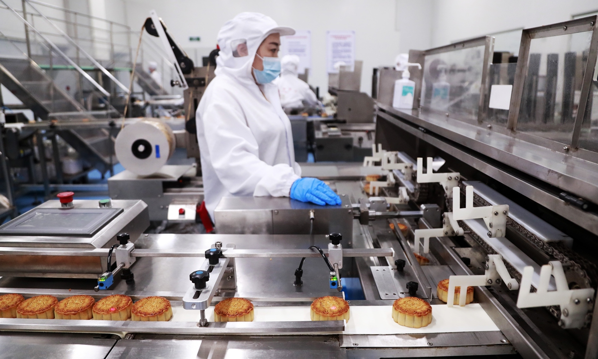 An automated assembly line is running at full capacity to produce moon cakes in Shanghai on Thursday ahead of the upcoming Mid-Autumn Festival, which falls on October 1 this year. The facility can produce more than 200,000 cakes per day. Photo: cnsphoto
