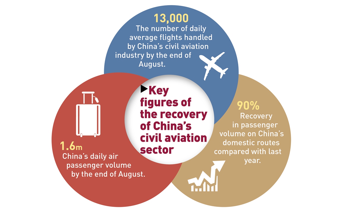 By the end of August, daily average flights handled by China's civil aviation industry came in at 13,000, around 90 percent compared with the volume before the pandemic outbreak.