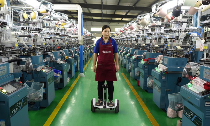 A worker inspects machines at a smart workshop of a hosiery company in Zhuji, east China's Zhejiang Province, Oct. 23, 2019. (Xinhua/Han Chuanhao)