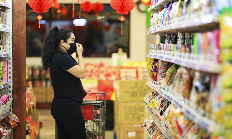 A customer wearing a face mask shops in a supermarket in Los Angeles, California, the United States, March 4, 2020. (Xinhua/Li Ying)