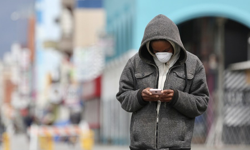 A man wearing a mask is seen on a street near Venice Beach, Los Angeles, the United States, April 10, 2020. (Xinhua)