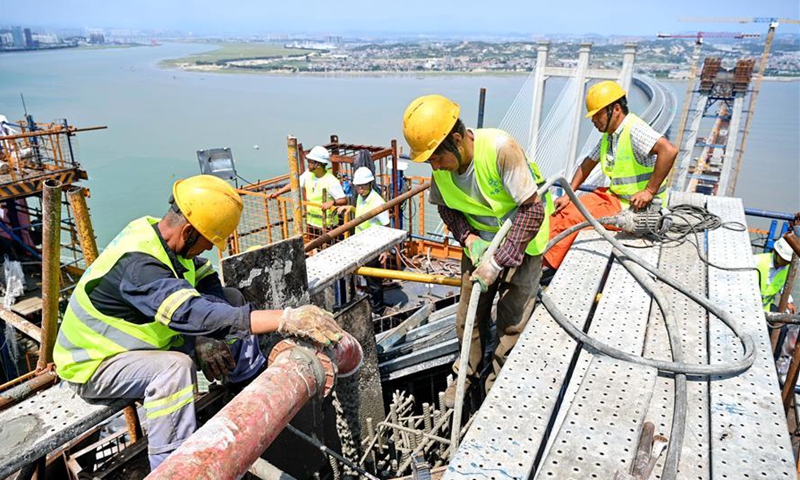 Workers pour concrete on the top of the south main tower of Quanzhou Bay cross-sea bridge of the Fuzhou-Xiamen high-speed railway in southeast China's Fujian Province, Sept. 15, 2020. The main structure of the south main tower of Quanzhou Bay cross-sea bridge has been completed on Tuesday. The 20-km-long bridge is a part of the Fuzhou-Xiamen high-speed railway that is designed to come on stream in 2022. (Xinhua/Lin Shanchuan)