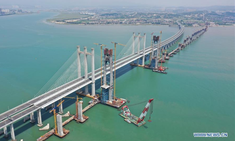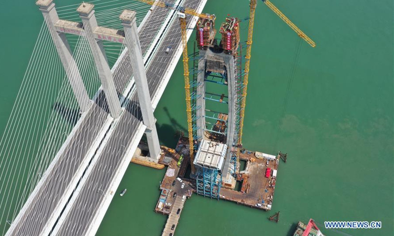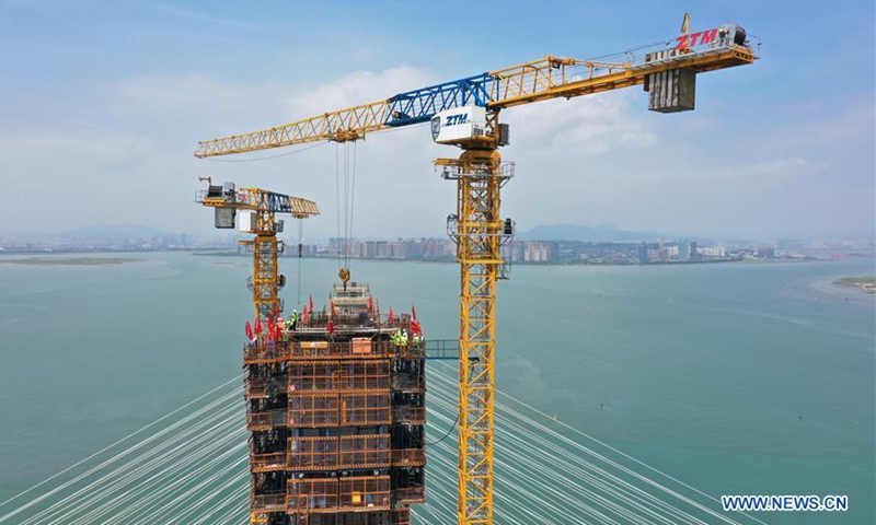 Aerial photo shows the construction site of the south main tower of Quanzhou Bay cross-sea bridge of the Fuzhou-Xiamen high-speed railway in southeast China's Fujian Province, Sept. 15, 2020. The main structure of the south main tower of Quanzhou Bay cross-sea bridge has been completed on Tuesday. The 20-km-long bridge is a part of the Fuzhou-Xiamen high-speed railway that is designed to come on stream in 2022. (Xinhua/Lin Shanchuan)
