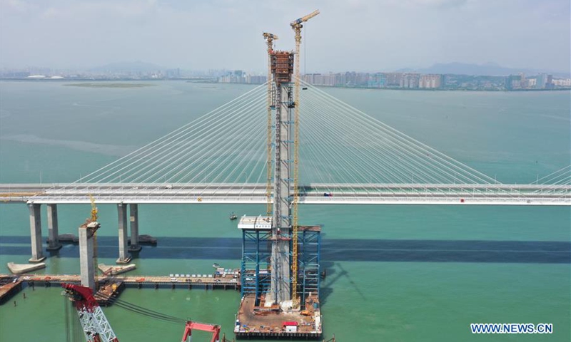 Aerial photo shows the south main tower of Quanzhou Bay cross-sea bridge of the Fuzhou-Xiamen high-speed railway in southeast China's Fujian Province, Sept. 15, 2020. The main structure of the south main tower of Quanzhou Bay cross-sea bridge has been completed on Tuesday. The 20-km-long bridge is a part of the Fuzhou-Xiamen high-speed railway that is designed to come on stream in 2022. (Xinhua/Lin Shanchuan)
