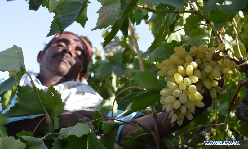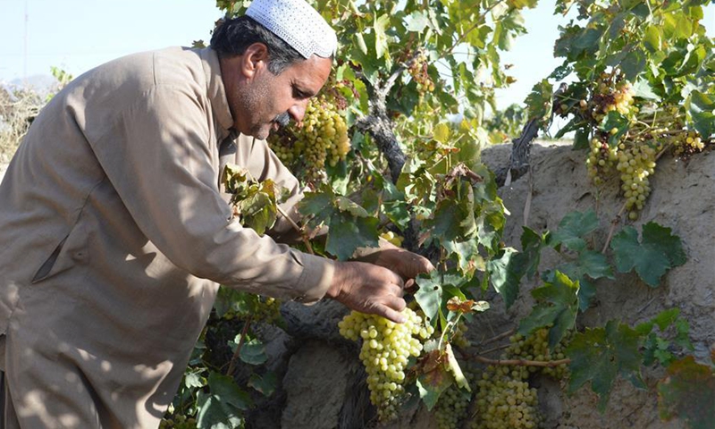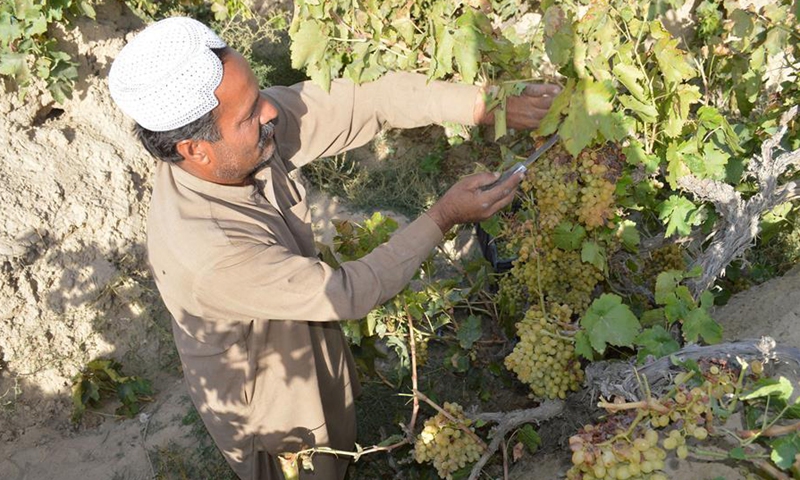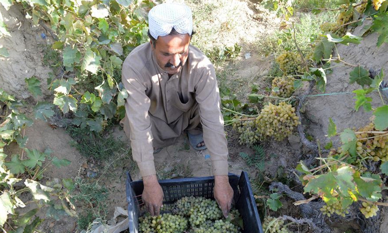 A man harvests grapes at a vineyard on the outskirts of southwest Pakistan's Quetta on Sept. 19, 2020. The grape harvest season has begun in Pakistan recently. (Photo by Irfan/Xinhua)