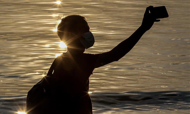 People take photos during sunset at Manila Bay in Manila, the Philippines on Sept. 20, 2020. (Xinhua/Rouelle Umali)
