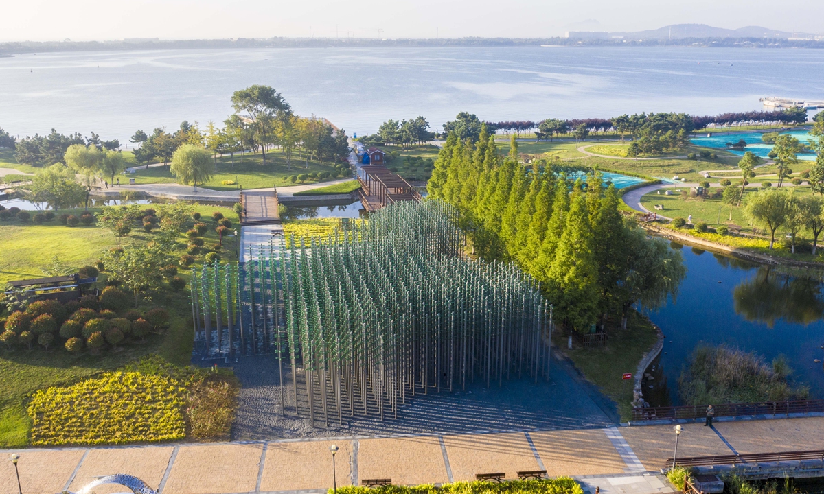 30,000 beer bottles are nailed into pillars to form a beer bottle jungle in Qingdao, East China's Shandong Province. The city is famous for Tsingdao beer, one of China's largest export beer brands to the world. Photo: IC