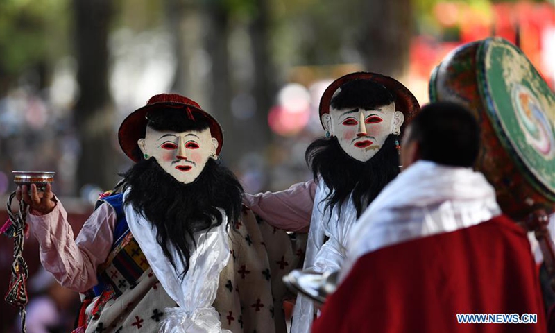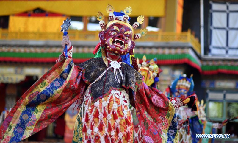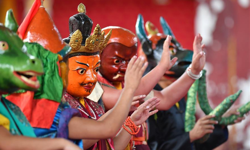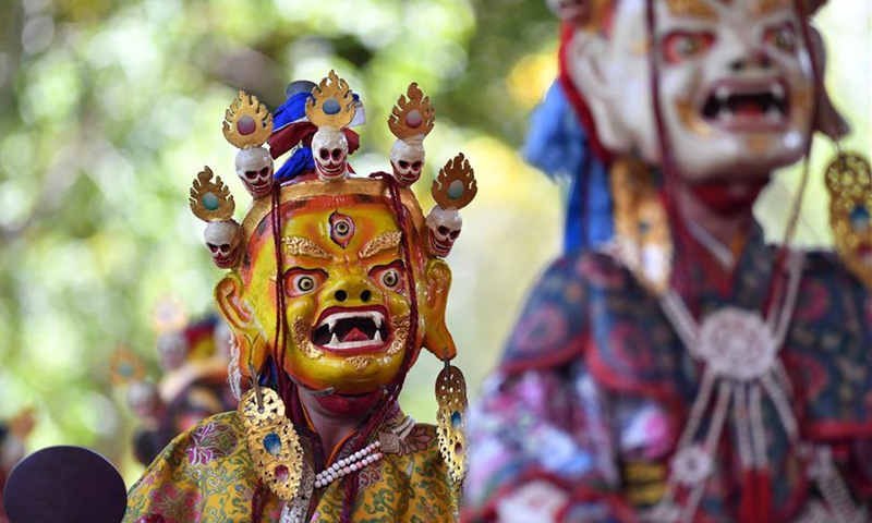 Masked Buddhist monks perform during an annual Cham dance event to pray for good harvest and peaceful life at the Tashilhunpo Monastery in Xigaze, southwest China's Tibet Autonomous Region, Sept. 22, 2020. (Xinhua/Chogo)