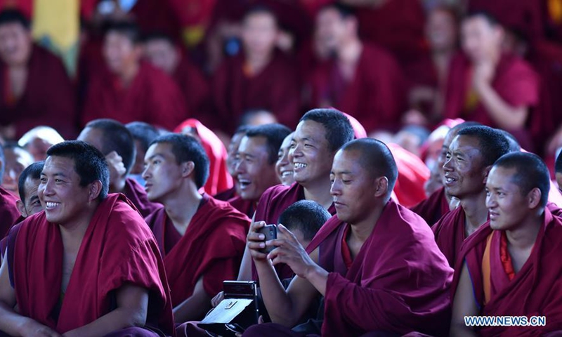 Buddhist monks watch an annual Cham dance event to pray for good harvest and peaceful life at the Tashilhunpo Monastery in Xigaze, southwest China's Tibet Autonomous Region, Sept. 22, 2020. (Xinhua/Chogo)