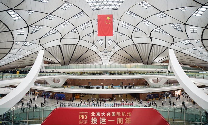 A flag-raising ceremony is held by the Civil Aviation Administration of China to mark the first anniversary of the Beijing Daxing International Airport in Beijing, capital of China, Sept. 25, 2020. The Beijing Daxing International Airport celebrated its first anniversary on Friday. The total passenger throughput at the newly-built airport exceeded the 10 million mark on Tuesday after it began operation last September. (Xinhua/Peng Ziyang)