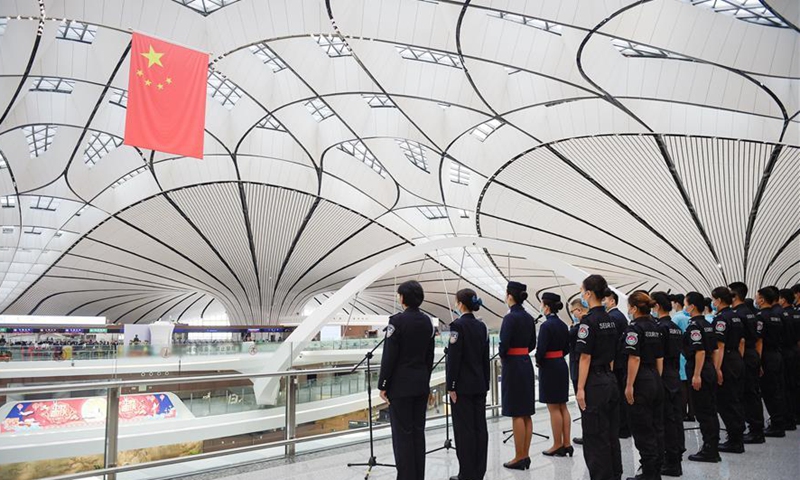 Staff members take part in a flag-raising ceremony held by the Civil Aviation Administration of China to mark the first anniversary of the Beijing Daxing International Airport in Beijing, capital of China, Sept. 25, 2020. The Beijing Daxing International Airport celebrated its first anniversary on Friday. The total passenger throughput at the newly-built airport exceeded the 10 million mark on Tuesday after it began operation last September. (Xinhua/Peng Ziyang)