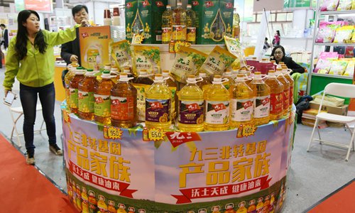 Cooking oil using non-genetically modified crops on display at an agriculture exhibition in Beijing on April 19 Photo: IC
