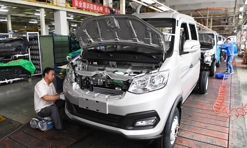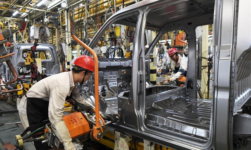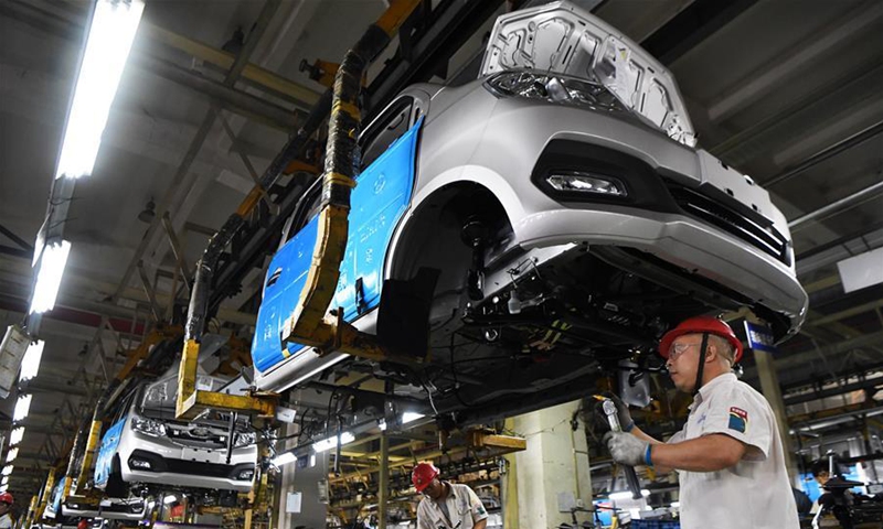 Workers assemble vehicles in a smart factory of Chang'an Kuayue Automobile Co., Ltd. in Wanzhou District, southwest China's Chongqing Municipality, Sept. 23, 2020. In recent years, Wanzhou District has stepped up measures to make the local manufacturing industry smarter. Factories have become more efficient with the introduction of industrial robots and cloud platforms. (Xinhua/Wang Quanchao)