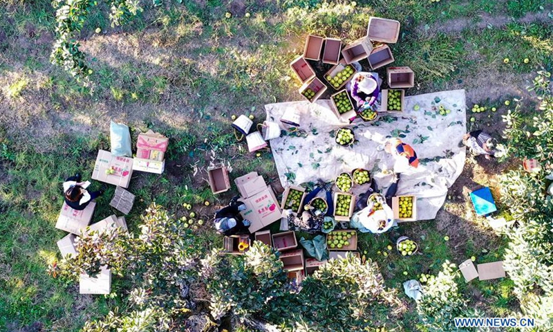 Aerial photo taken on Sept. 27, 2020 shows farmers harvesting apple pears at an apple pear planting base in Longjing City of Yanbian Korean Autonomous Prefecture, northeast China's Jilin Province. Apple pears in Longjing have entered into the harvest season. (Xinhua/Yan Linyun)