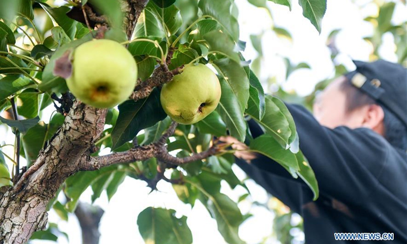 A farmer harvests apple pears at an apple pear planting base in Longjing City of Yanbian Korean Autonomous Prefecture, northeast China's Jilin Province, Sept. 27, 2020. Apple pears in Longjing have entered into the harvest season. (Xinhua/Yan Linyun)