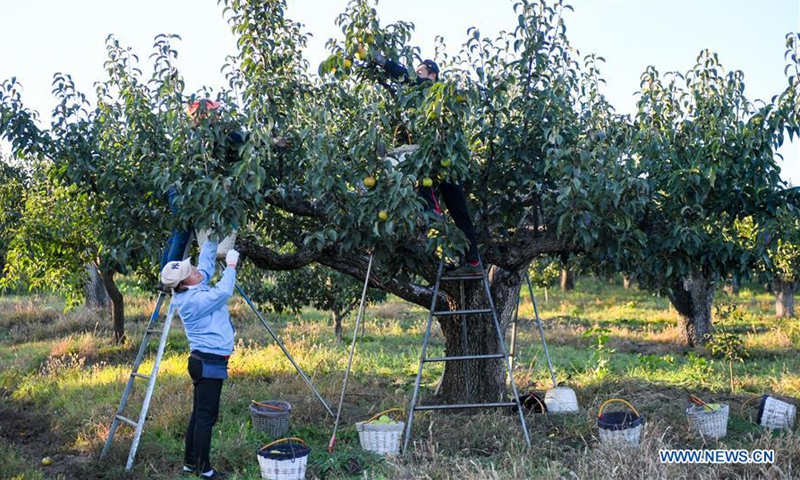 Farmers harvest apple pears at an apple pear planting base in Longjing City of Yanbian Korean Autonomous Prefecture, northeast China's Jilin Province, Sept. 27, 2020. Apple pears in Longjing have entered into the harvest season. (Xinhua/Yan Linyun)
