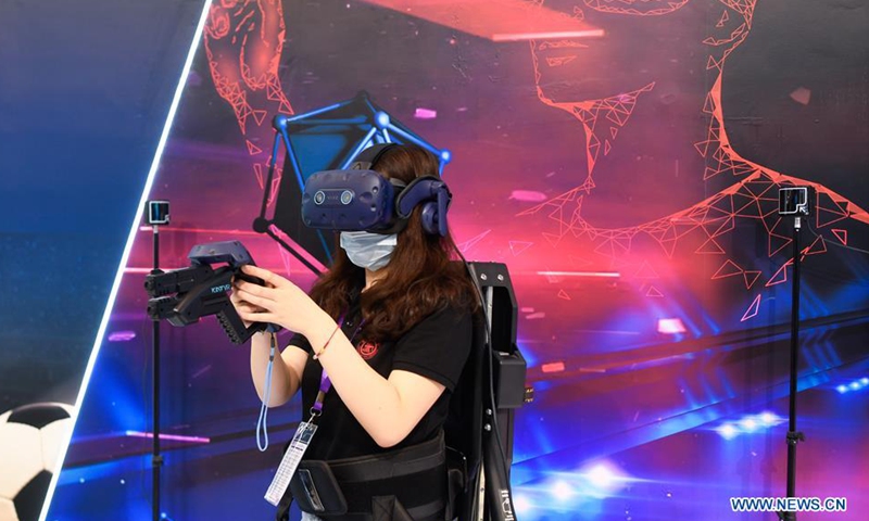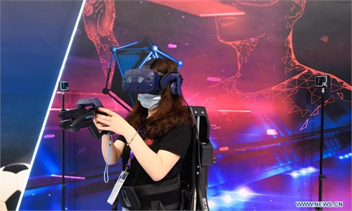 A visitor plays a VR game via 5G-powered devices at the 10th China Smart City and Intelligent Economy Expo in Ningbo, east China's Zhejiang Province, Sept. 11, 2020. Unveiled here on Friday, the 10th China Smart City and Intelligent Economy Expo showcases the latest products and technologies in the area.Photo:Xinhua