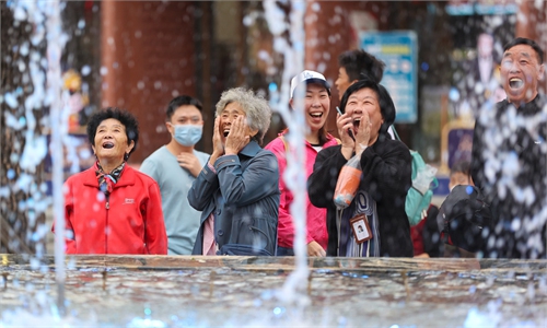 Tourists have fun shouting instructions at a voice-controlled fountain at a square in Xi’an, Northwest China’s Shaanxi Province, ...
