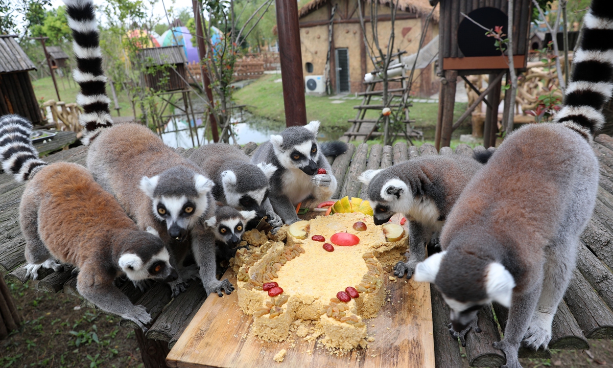 Ring-tailed lemurs at a safari park in Nantong, East China's Jiangsu Province, enjoy a monkey-shaped mooncake for the upcoming Mid-Autumn Festival. Photo: IC