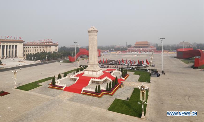 A ceremony presenting flower baskets to deceased national heroes on the Martyrs' Day is held at Tian'anmen Square in Beijing, capital of China, on Sept. 30, 2019. (File photo: Xinhua)