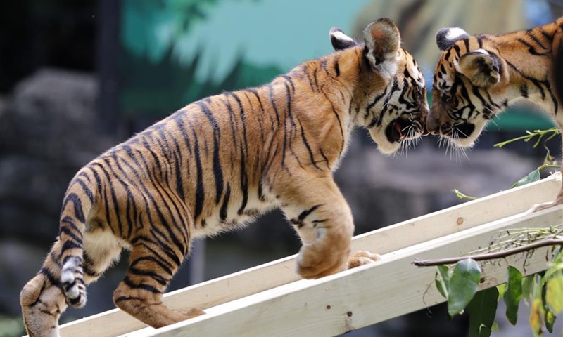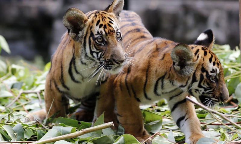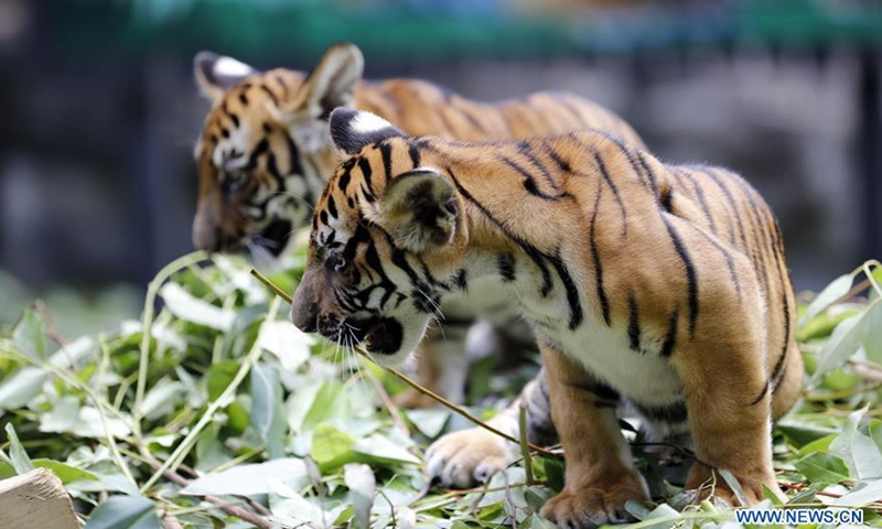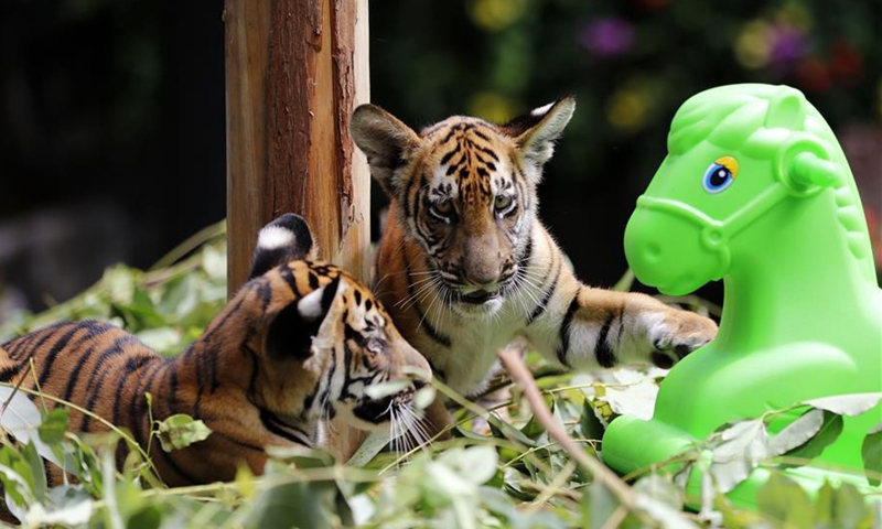 Twin cubs of South China tiger have fun at Chimelong Safari Park in Guangzhou, capital of south China's Guangdong Province, Sept. 28, 2020. Twin cubs of South China tiger, born on June 7, celebrated their 100-day birthday on Monday. Photo:Xinhua