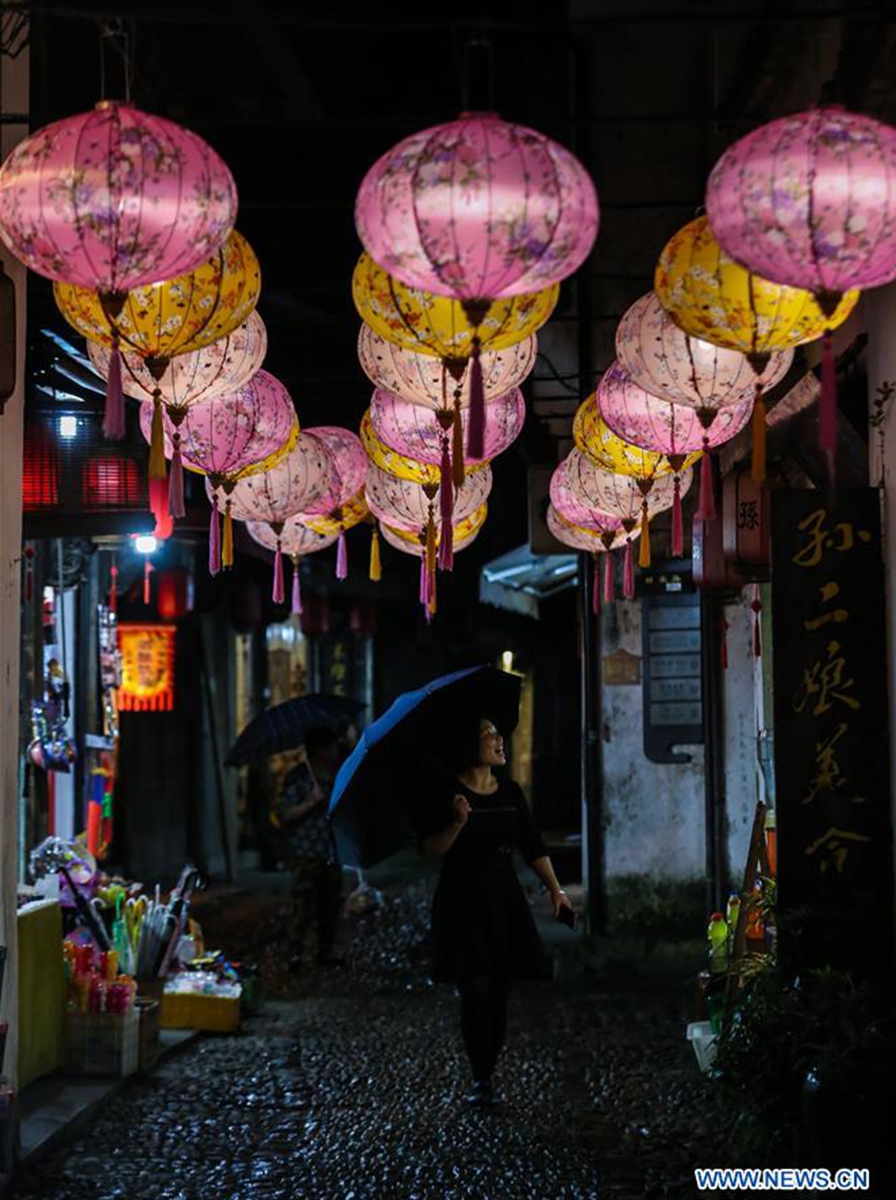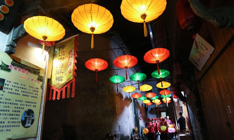 Lanterns are seen at a temple fair in Longmen Ancient Town of Hangzhou, east China's Zhejiang Province, Sept. 29, 2020. The temple fair kicked off here on Tuesday held various activities including lantern riddle, folk dance performance and unique folk custom display. (Xinhua/Xu Yu)
