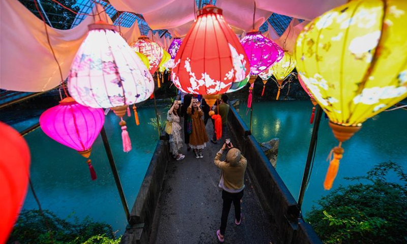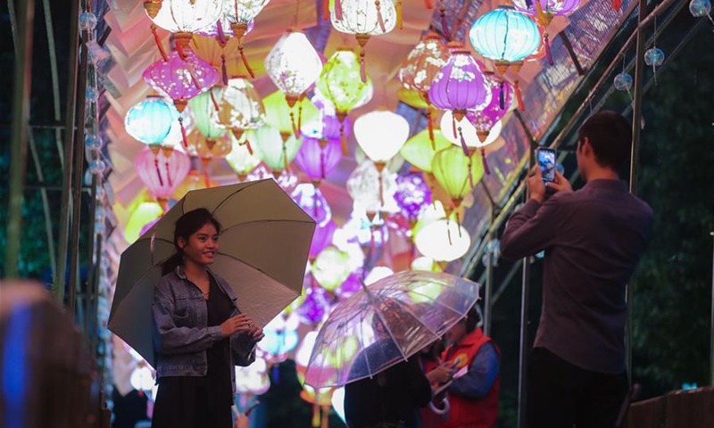 Tourists view lanterns at a temple fair in Longmen Ancient Town of Hangzhou, east China's Zhejiang Province, Sept. 29, 2020. The temple fair kicked off here on Tuesday held various activities including lantern riddle, folk dance performance and unique folk custom display. (Xinhua/Xu Yu)