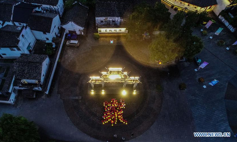 Aerial photo taken on Sept. 29, 2020 shows volunteers holding lanterns to form a Chinese character "jia", which means "home", at a temple fair in Longmen Ancient Town of Hangzhou, east China's Zhejiang Province. The temple fair kicked off here on Tuesday held various activities including lantern riddle, folk dance performance and unique folk custom display. (Xinhua/Xu Yu)