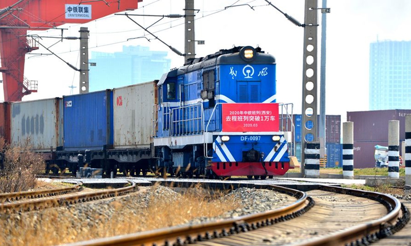 Photo taken on March 11, 2020 shows a China-Europe freight train bound for Mannheim of Germany departing from the Xinzhu Railway Station in Xi'an, northwest China's Shaanxi Province. File photo:Xinhua