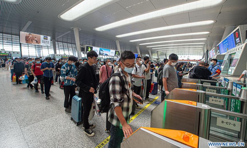 Travellers queue up to have their tickets checked at Hangzhou East Railway Station in Hangzhou, east China's Zhejiang Province, Sept. 30, 2020. The railway station has witnessed peaks in the number of passengers ahead of the National Day and Mid-Autumn Festival holidays. Photo:Xinhua