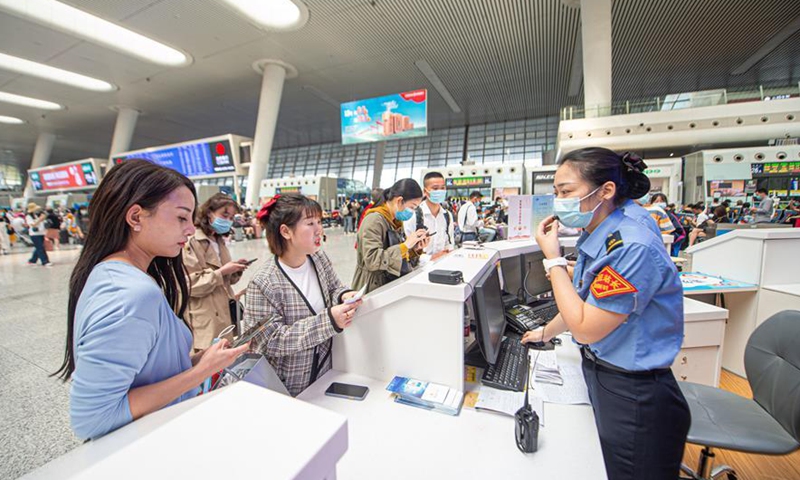 Travellers visit an information desk at Hangzhou East Railway Station in Hangzhou, east China's Zhejiang Province, Sept. 30, 2020. The railway station has witnessed peaks in the number of passengers ahead of the National Day and Mid-Autumn Festival holidays.Photo:Xinhua