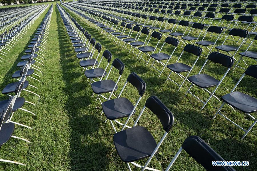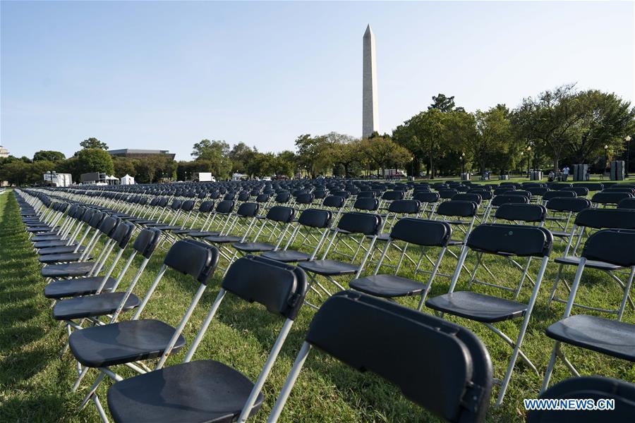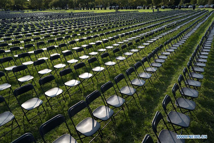 Empty chairs sit on the Ellipse near the White House in Washington, D.C., the United States, on Oct. 4, 2020. Twenty thousand empty chairs were set up near the White House on Sunday to mourn the more than 200,000 lives lost in United States from COVID-19. (Xinhua/Liu Jie)