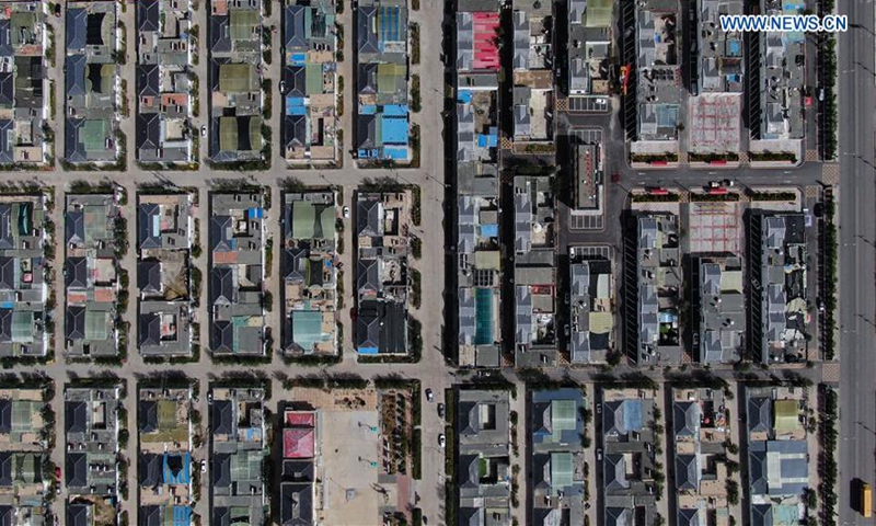 Aerial photo taken on Sept. 22, 2020 shows a village in Wulan County of northwest China's Qinghai Province. Thanks to the Qinghai-Tibet Railway and its extension railways, many tourist attractions in the province have been connected, which significantly promoted the tourism industry here and helped locals increase income. (Xinhua/Zhang Long)